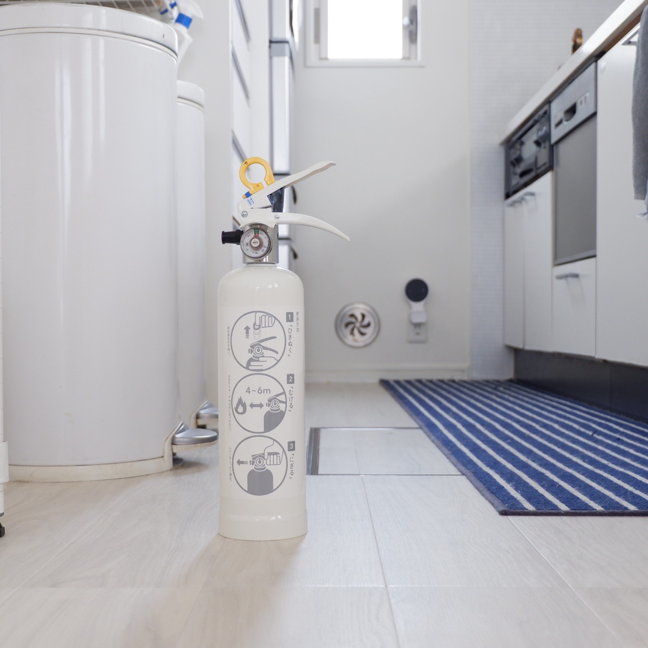 白い消火器は、キッチンに置いていても悪目立ちしません。