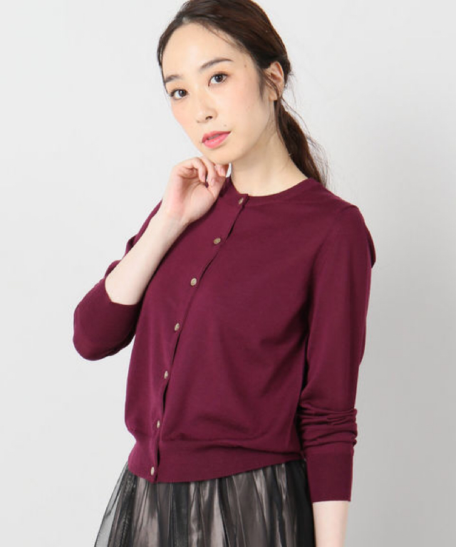 上品映えするシンプルなクルーネックカーディガン。