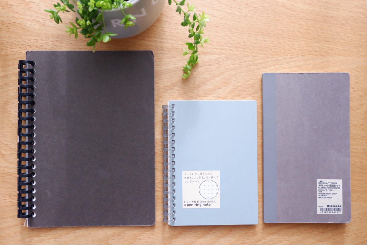 左から、無印良品の取り外せるリングノート、今回のリングノート、今使ってる無印のスリムノート。