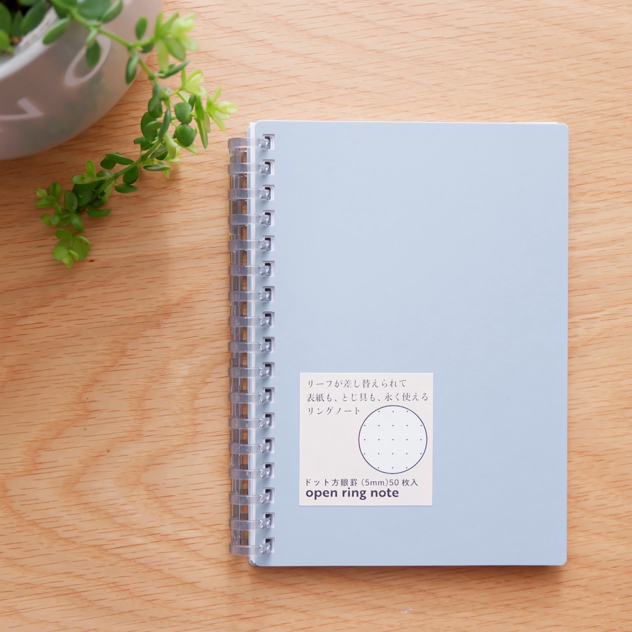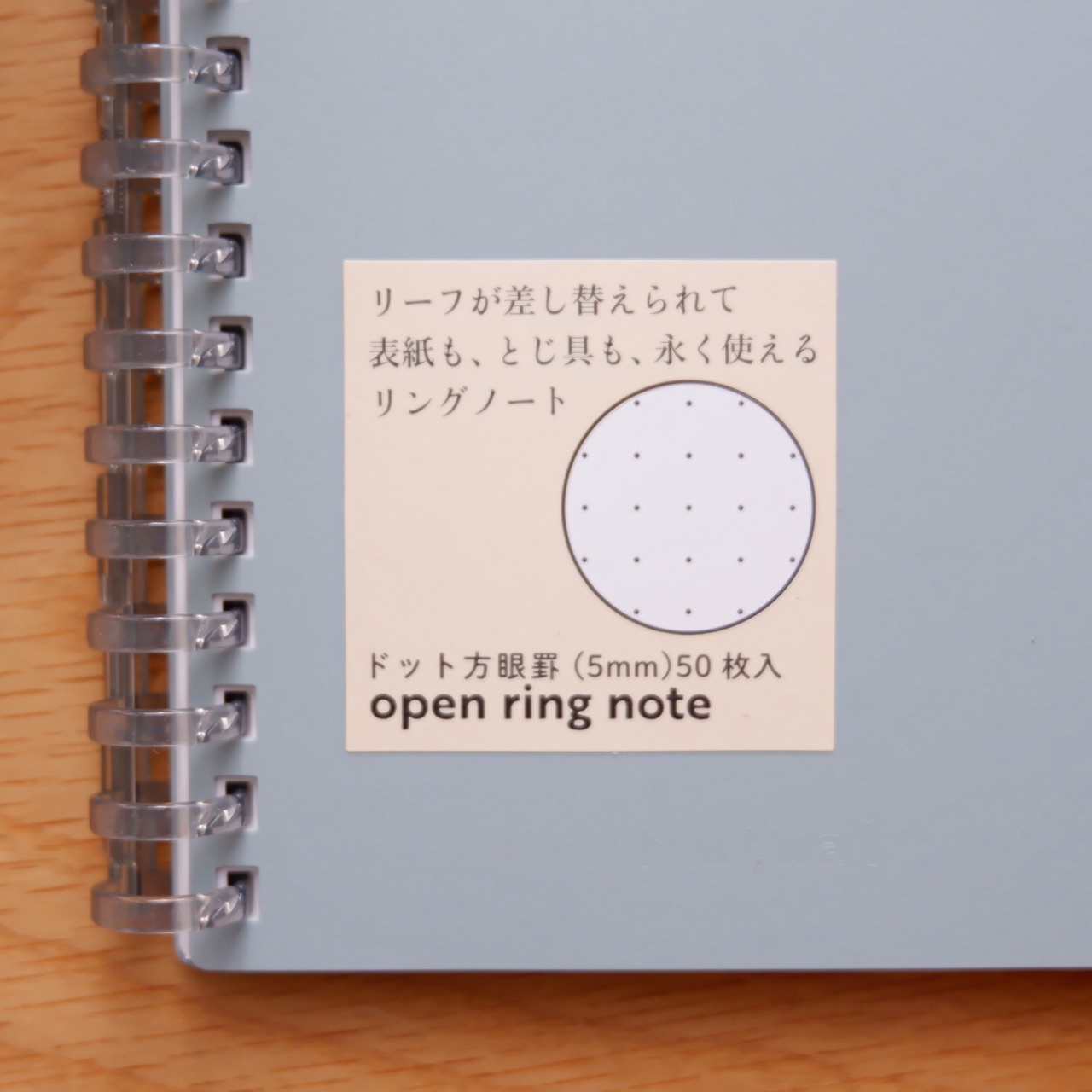 表紙も、とじ具も、長く使えるリングノート」と書かれている通り