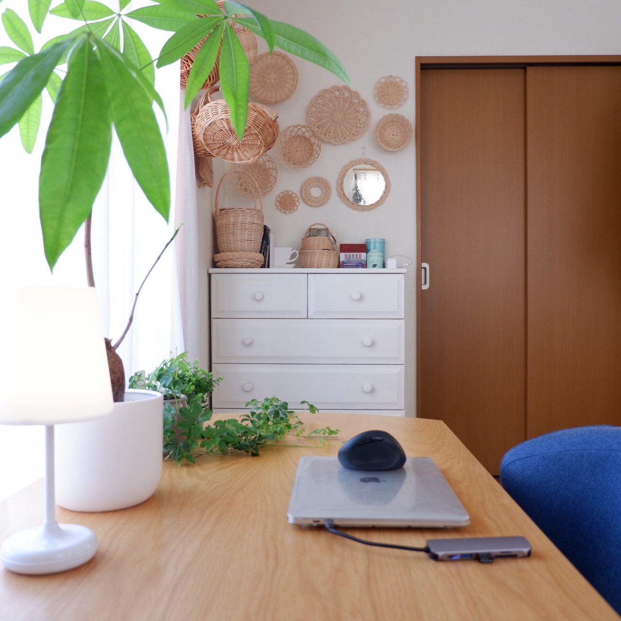 籐かごは壁面収納にしています。