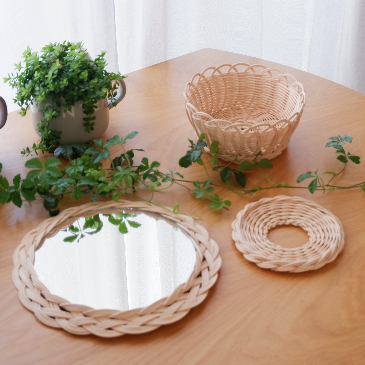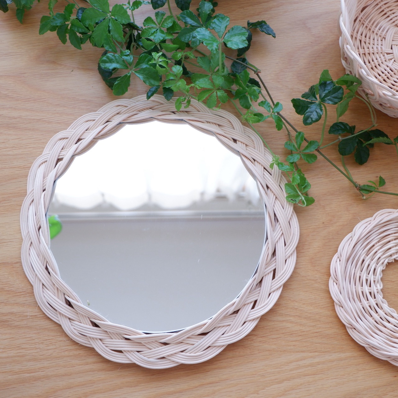 ミラーを籐で包みながら編んだ作品♪