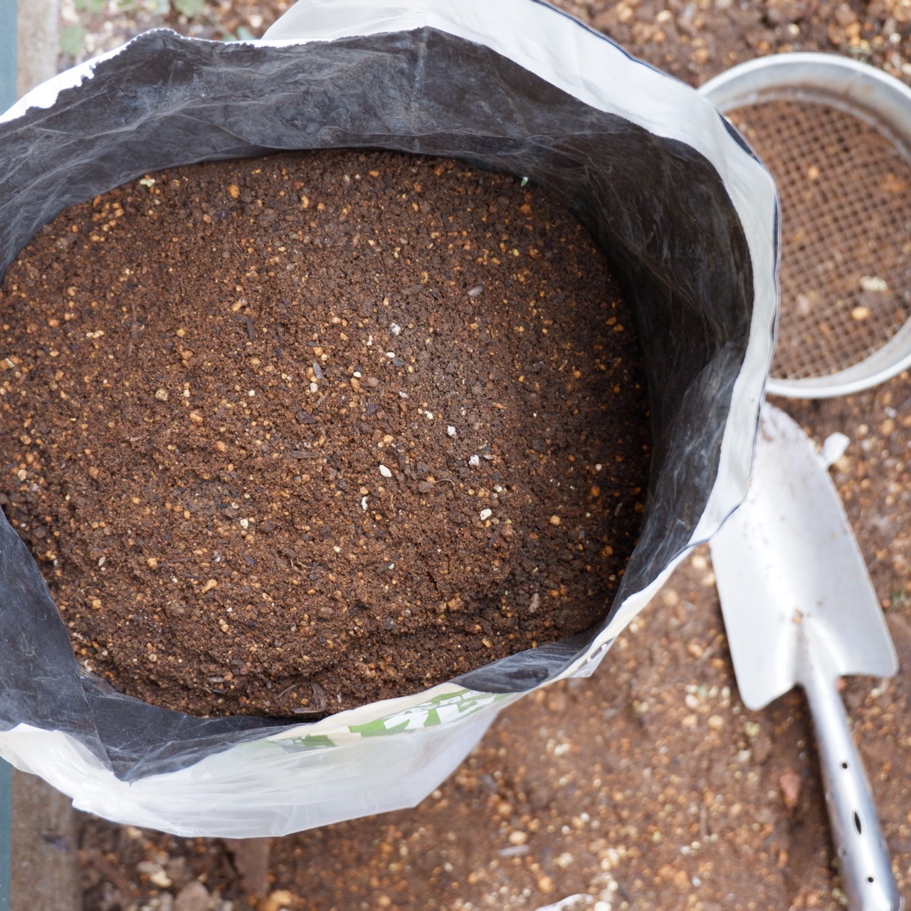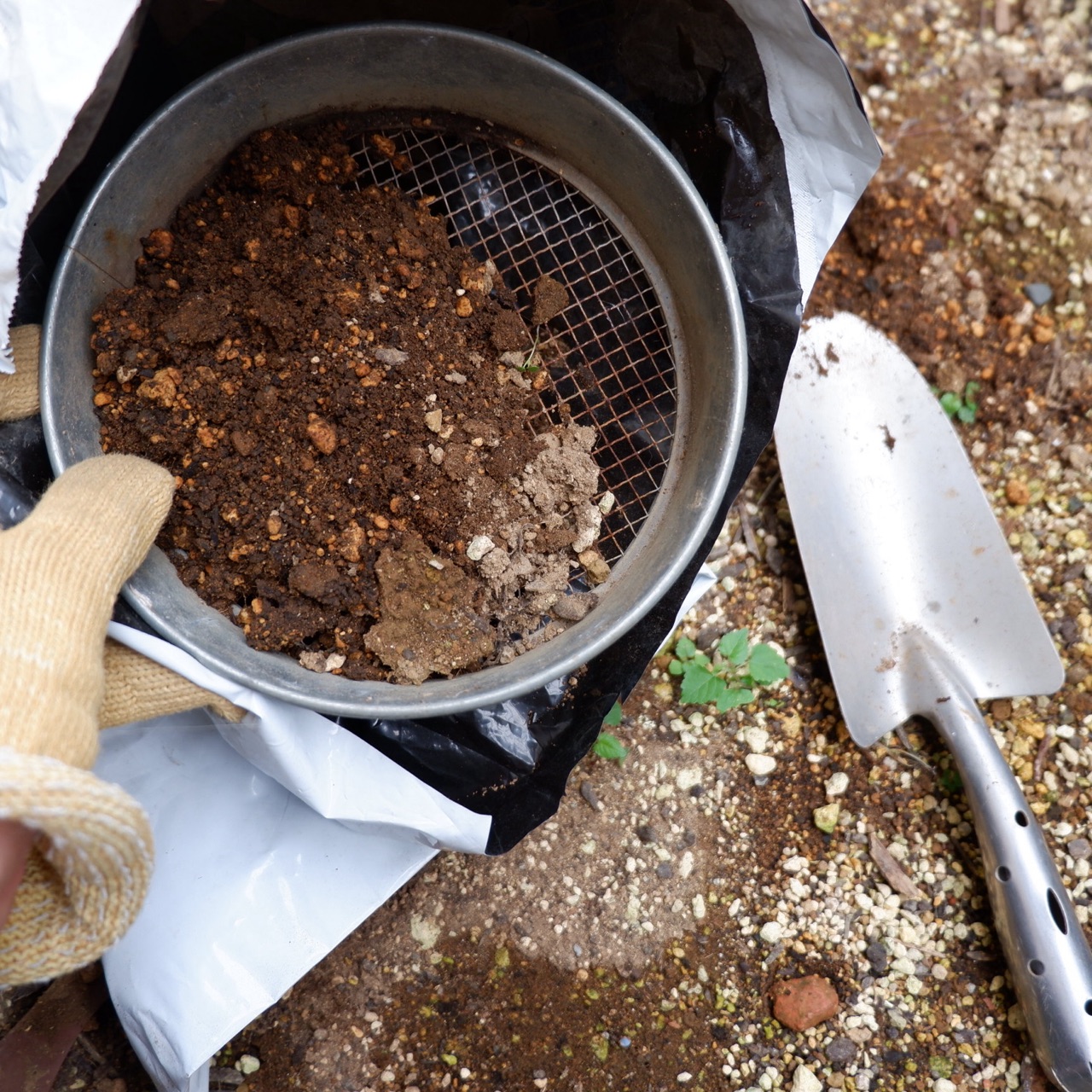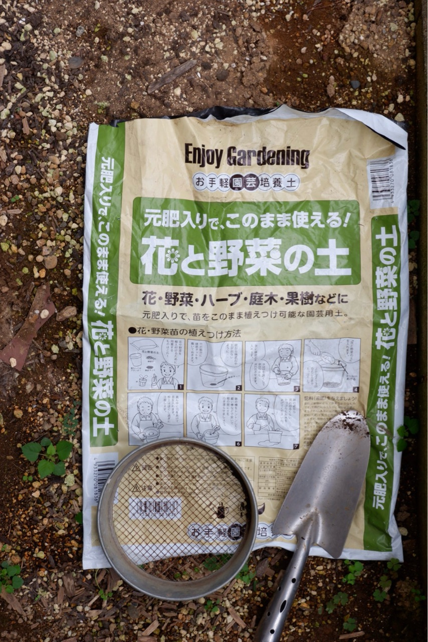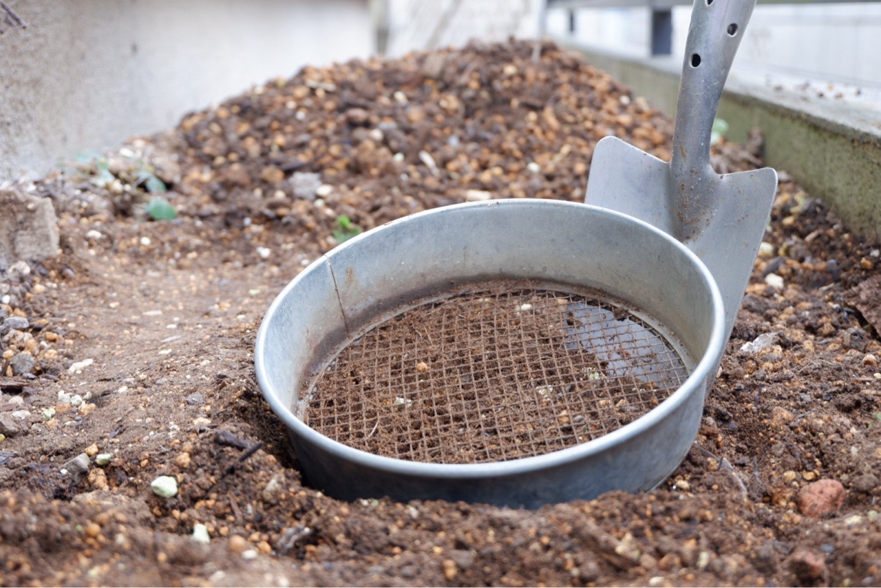 土をふるいにかけて、草や石、虫などを入れないように注意する。