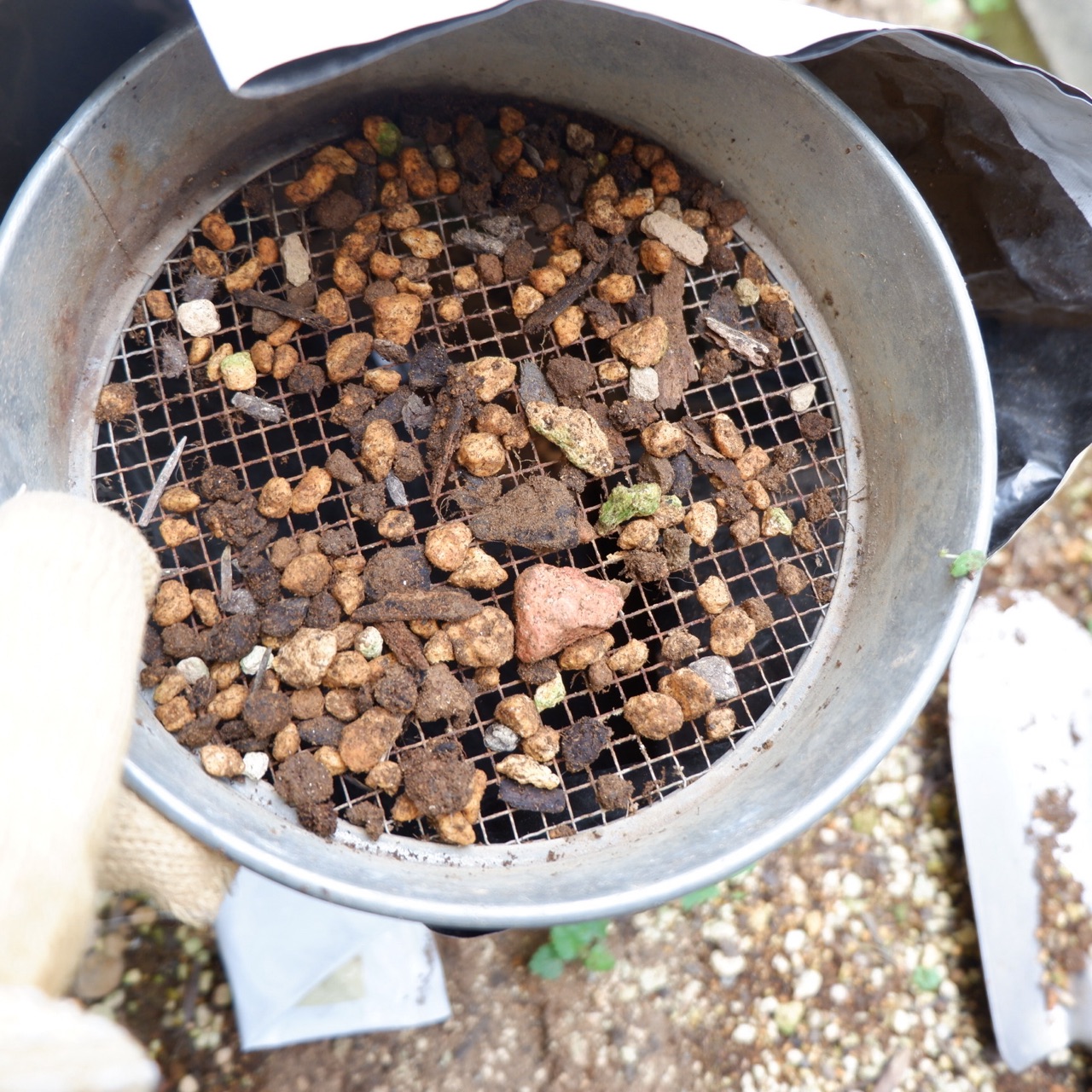 袋の半分くらい土ふるいした段階で