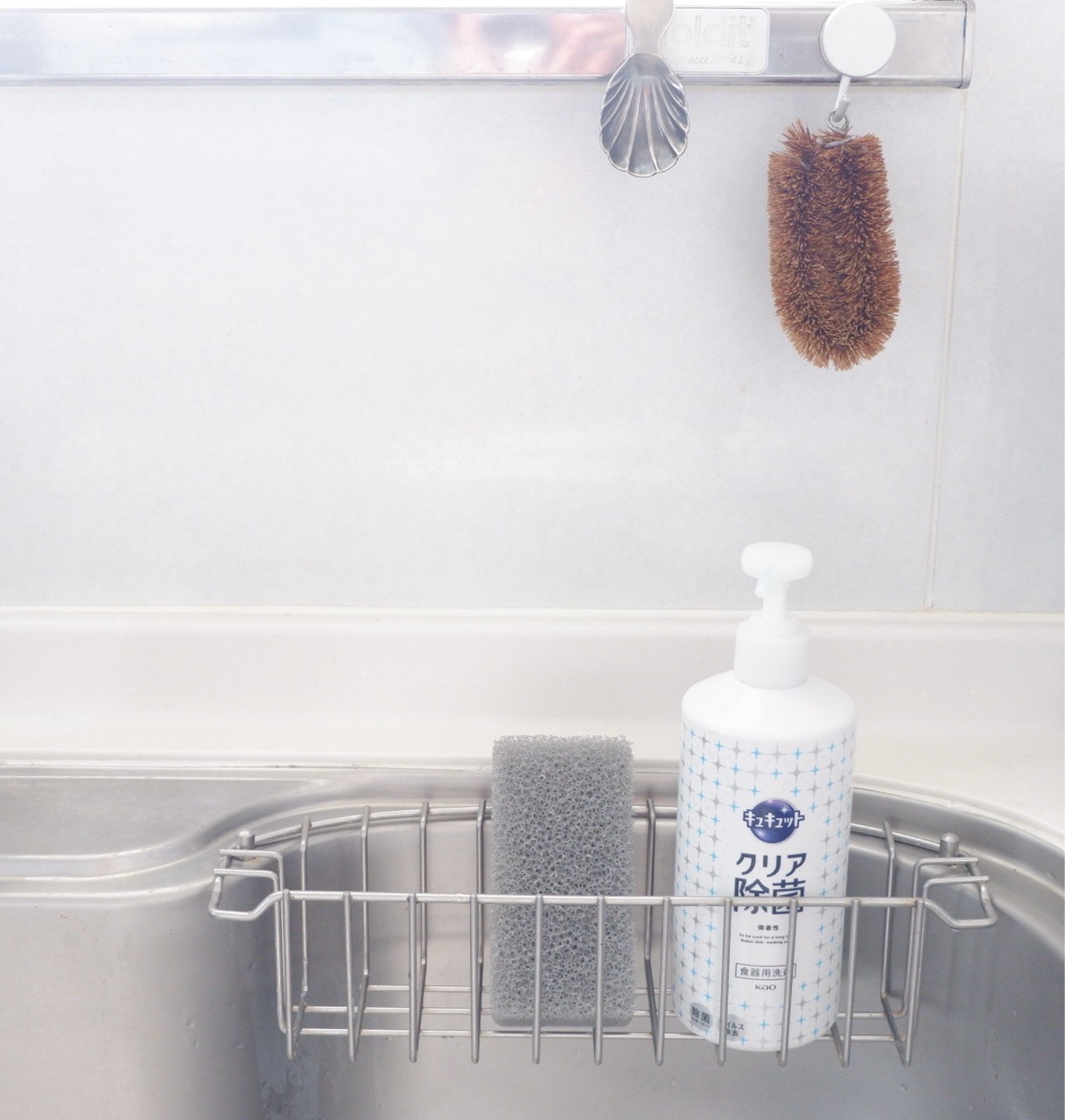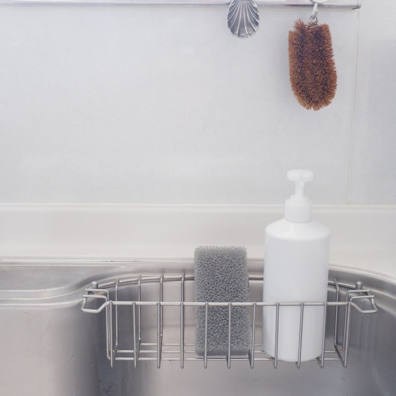 食器用洗剤を入れているスレンレスのカゴには