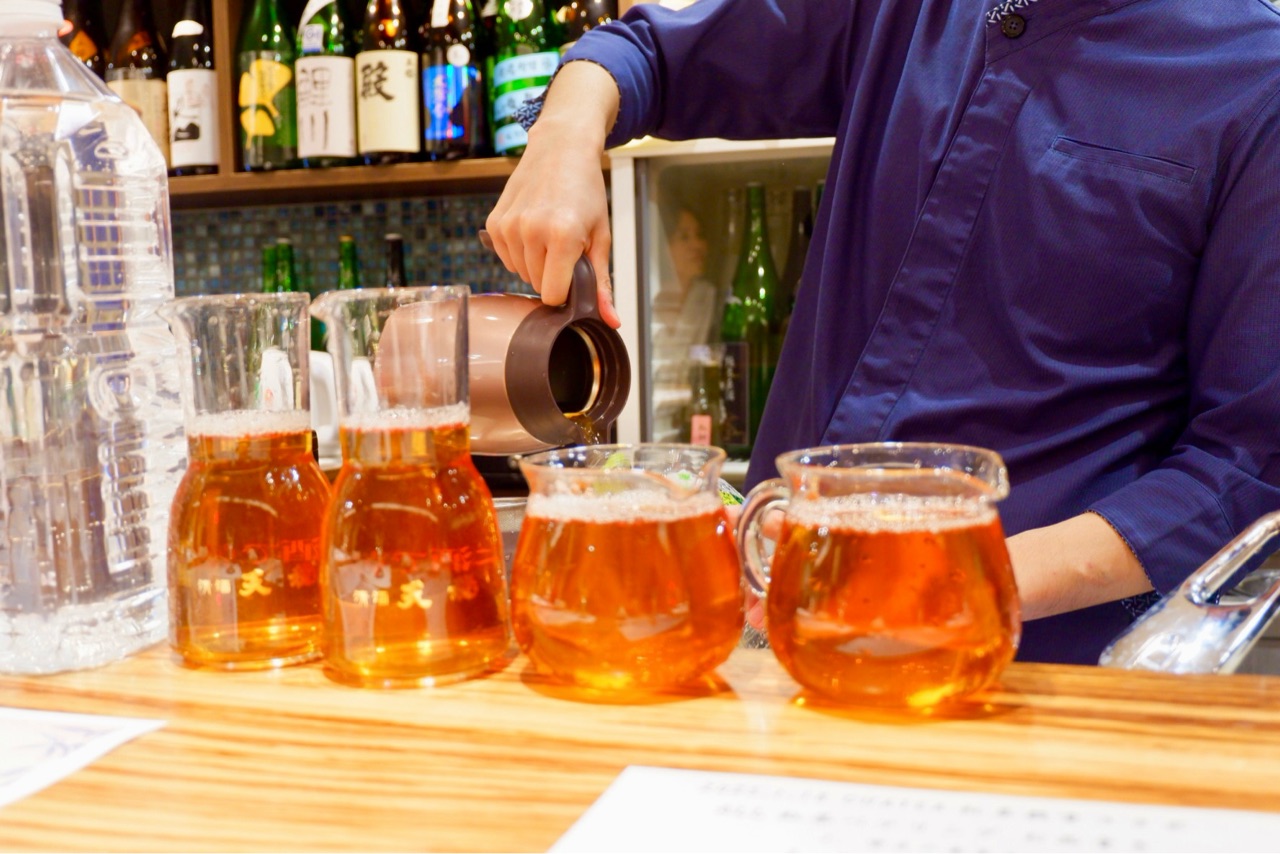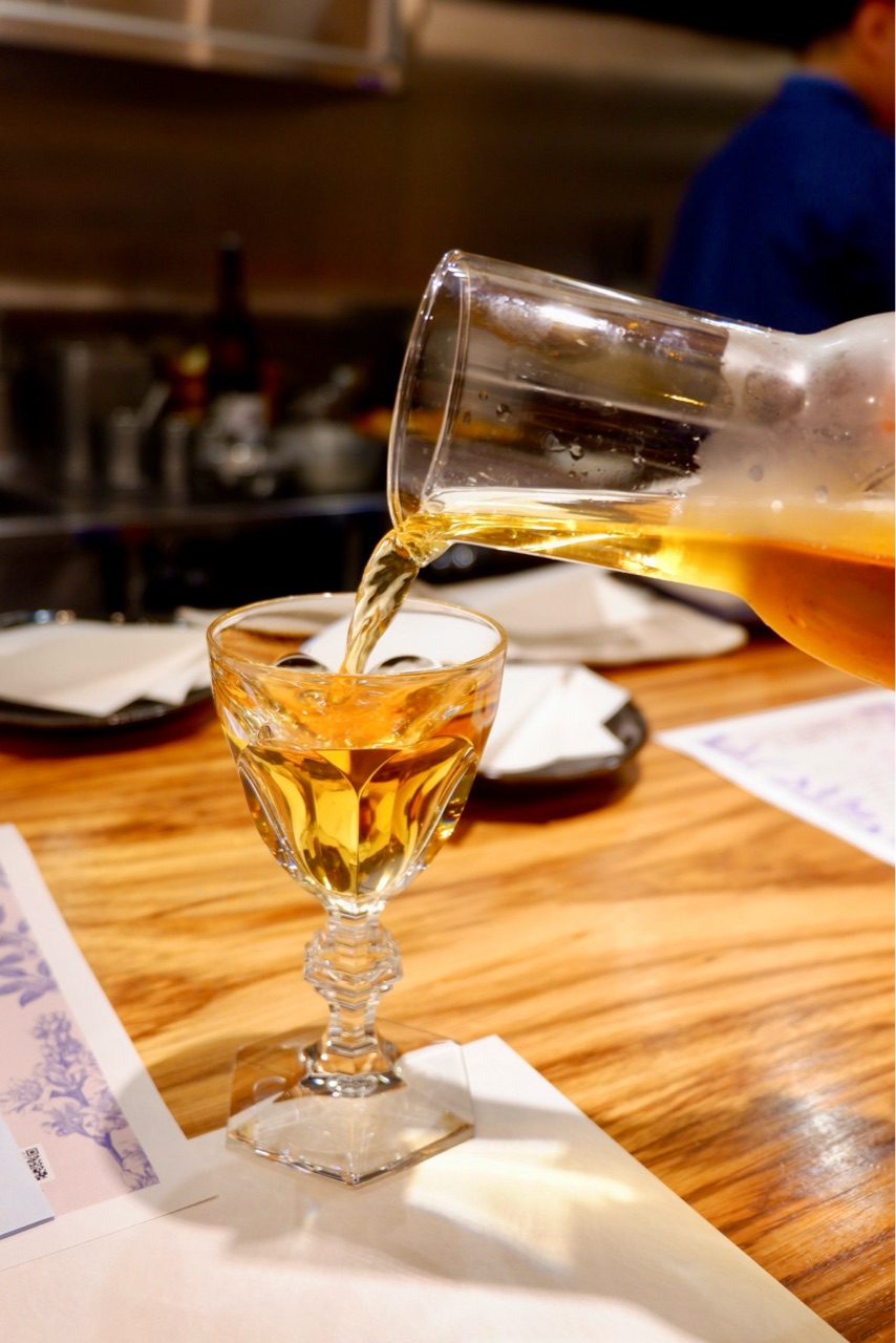 料理に合わせて水出し紅茶が注がれます。