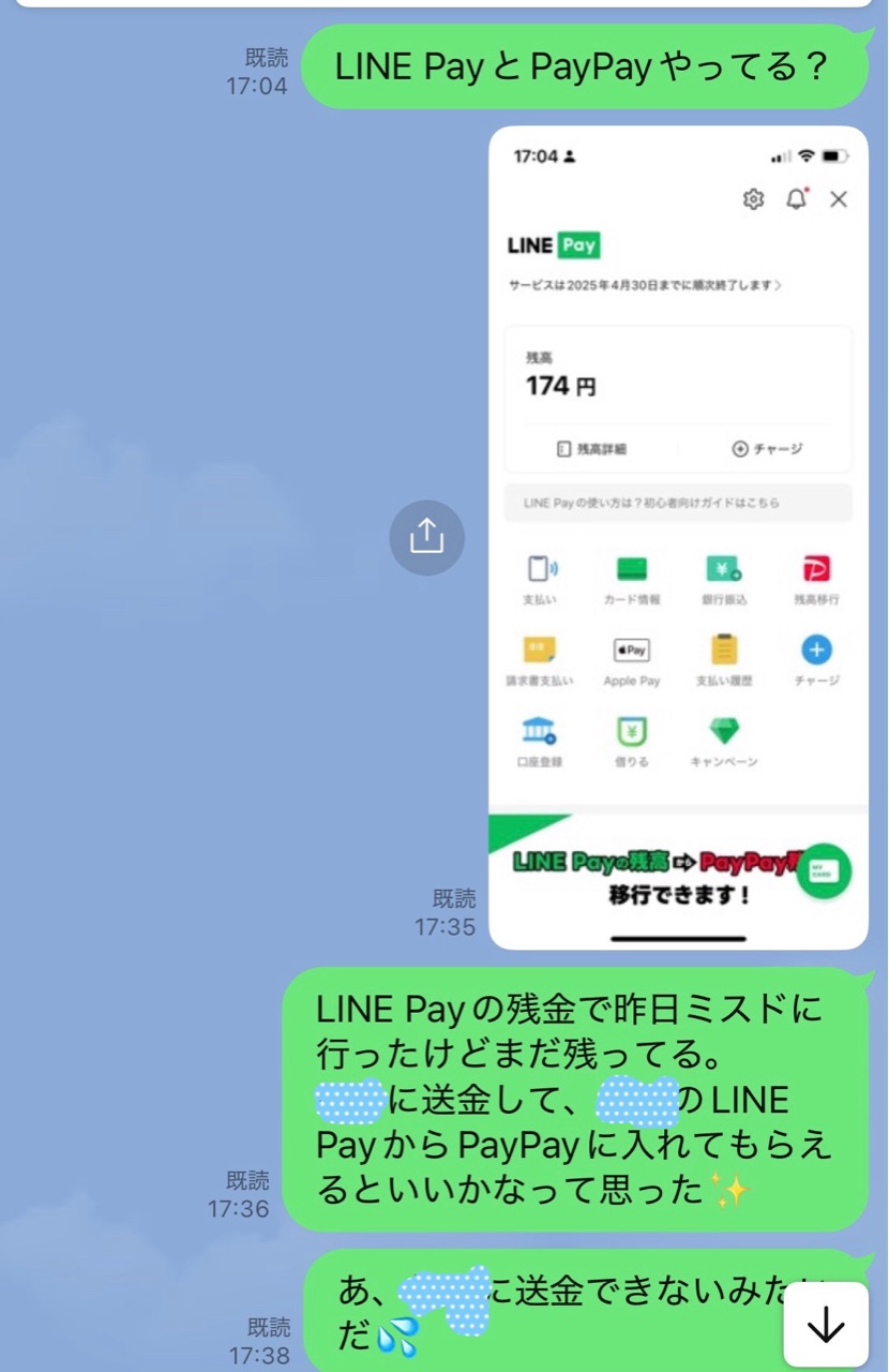 すでに、LINE間の送金のやり取りは終了していました。残念😢