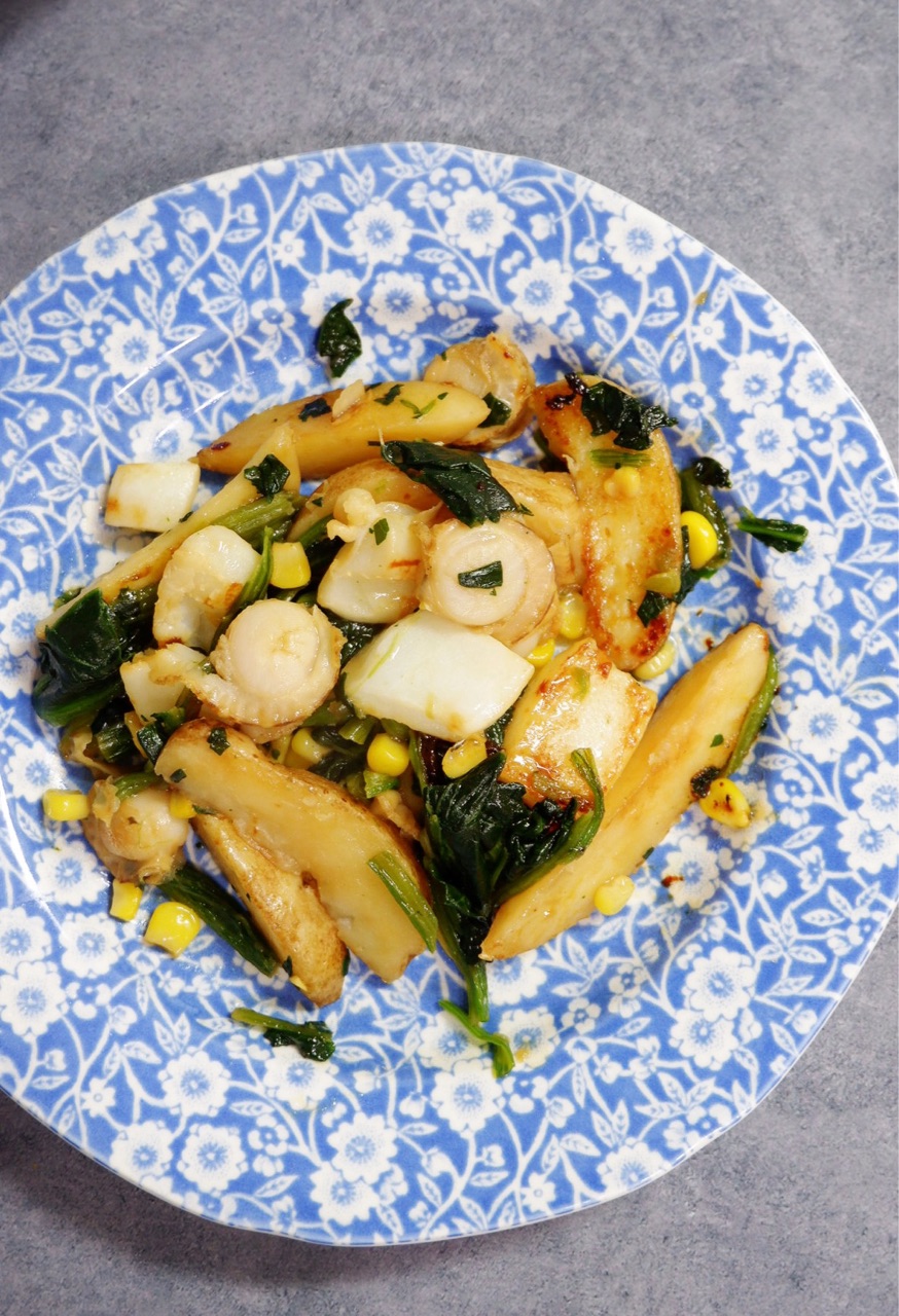 ホタテとイカ、じゃがいも、コーン、ほうれん草炒めの出来上がり✨
