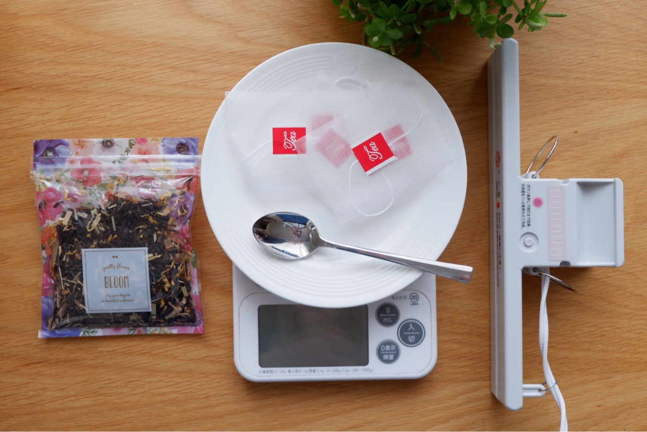 茶葉、はかり、ティーバッグの袋、スプーン類、シーラー。