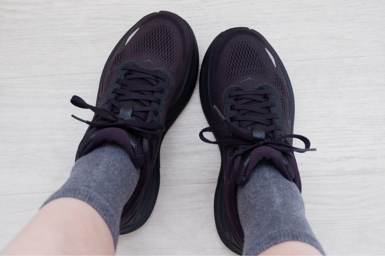 HOKAのスニーカーと着圧ハイソックス履いて