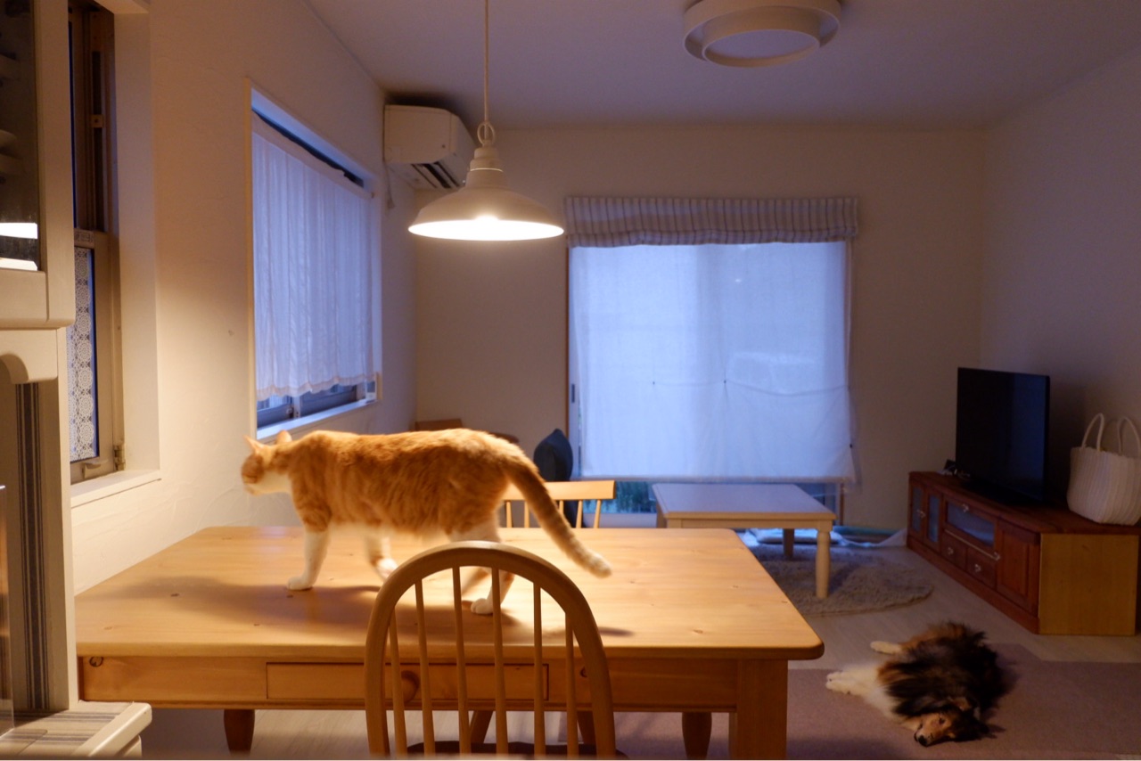 🐈早速、ガッチャンがテーブルに上がってチェックする図