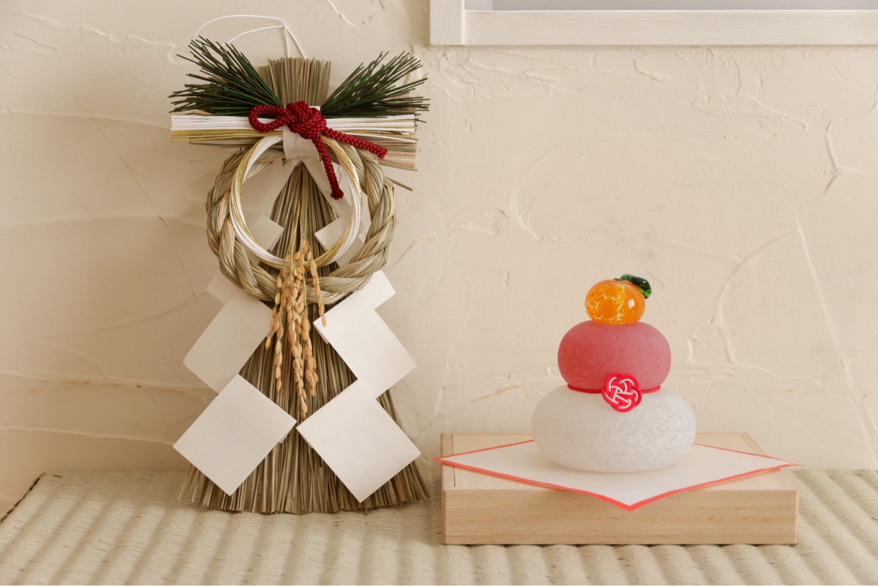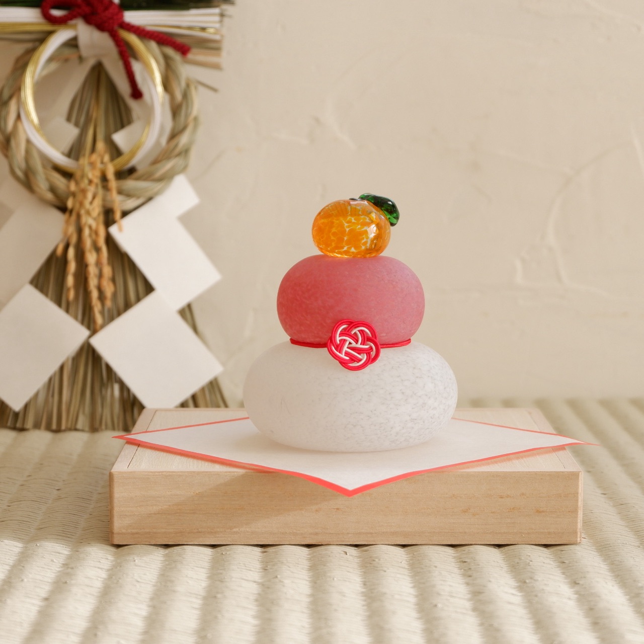 ガラスの鏡餅を玄関の棚に置けば完了です。