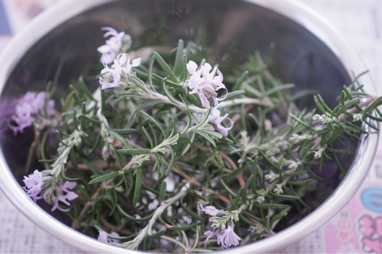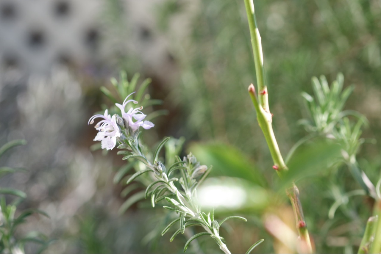 ちょうど庭のローズマリーに小さな花が咲いていたので